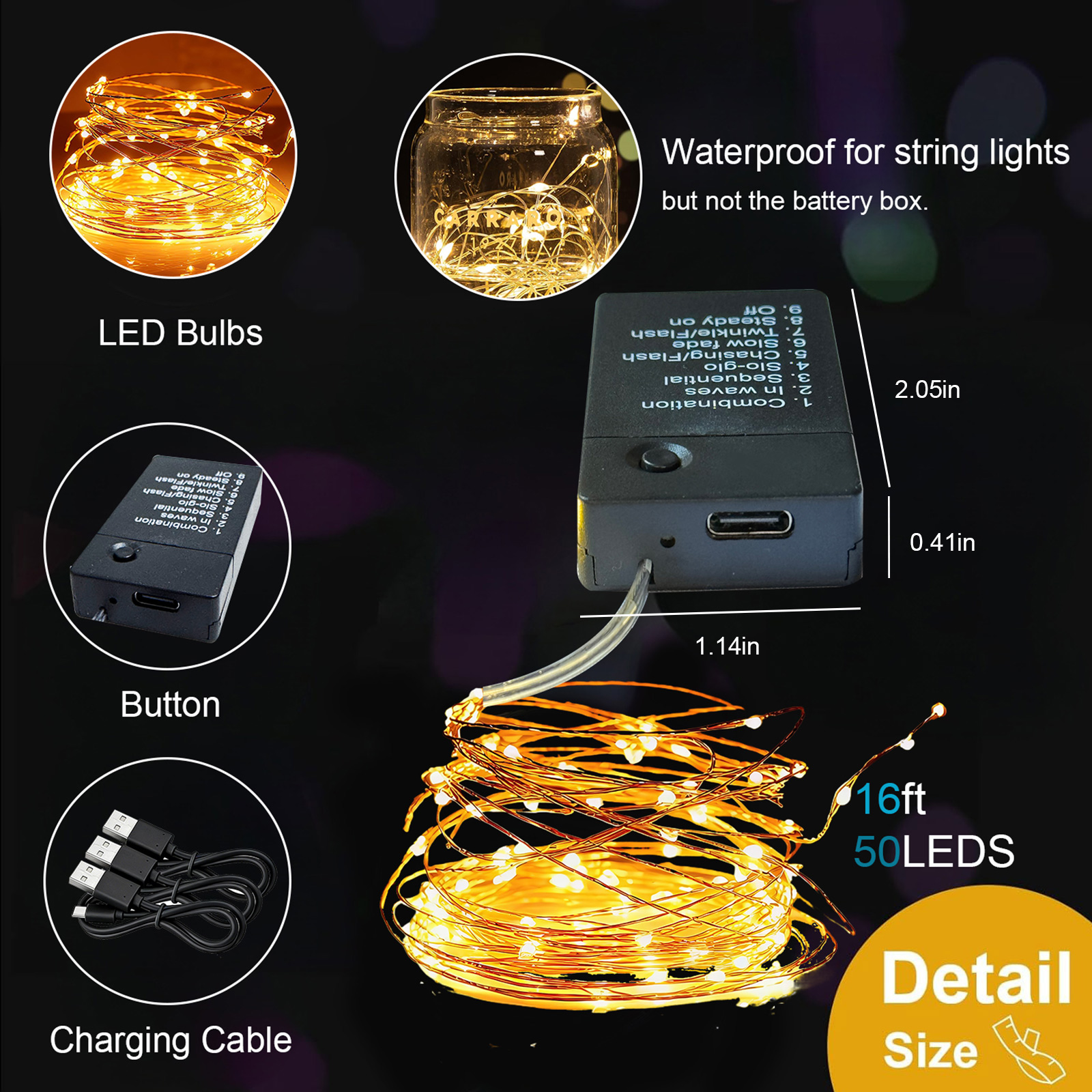 Powered by a large 600mAh rechargeable battery, our lights last twice as long as typical models (300mAh). Enjoy up to 8 hours of continuous illumination on a single charge, perfect for long parties, camping trips, or creating an all-night ambient glow. The built-in battery saves you from constantly replacing disposable ones. - Longer & Brighter: 16ft with 50 Warm White LEDs