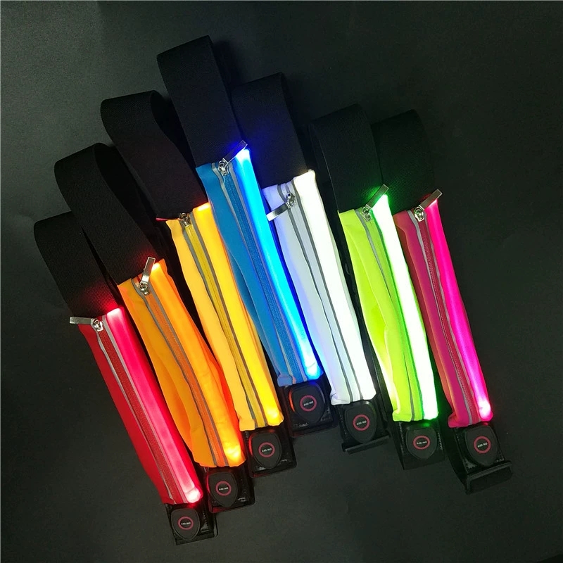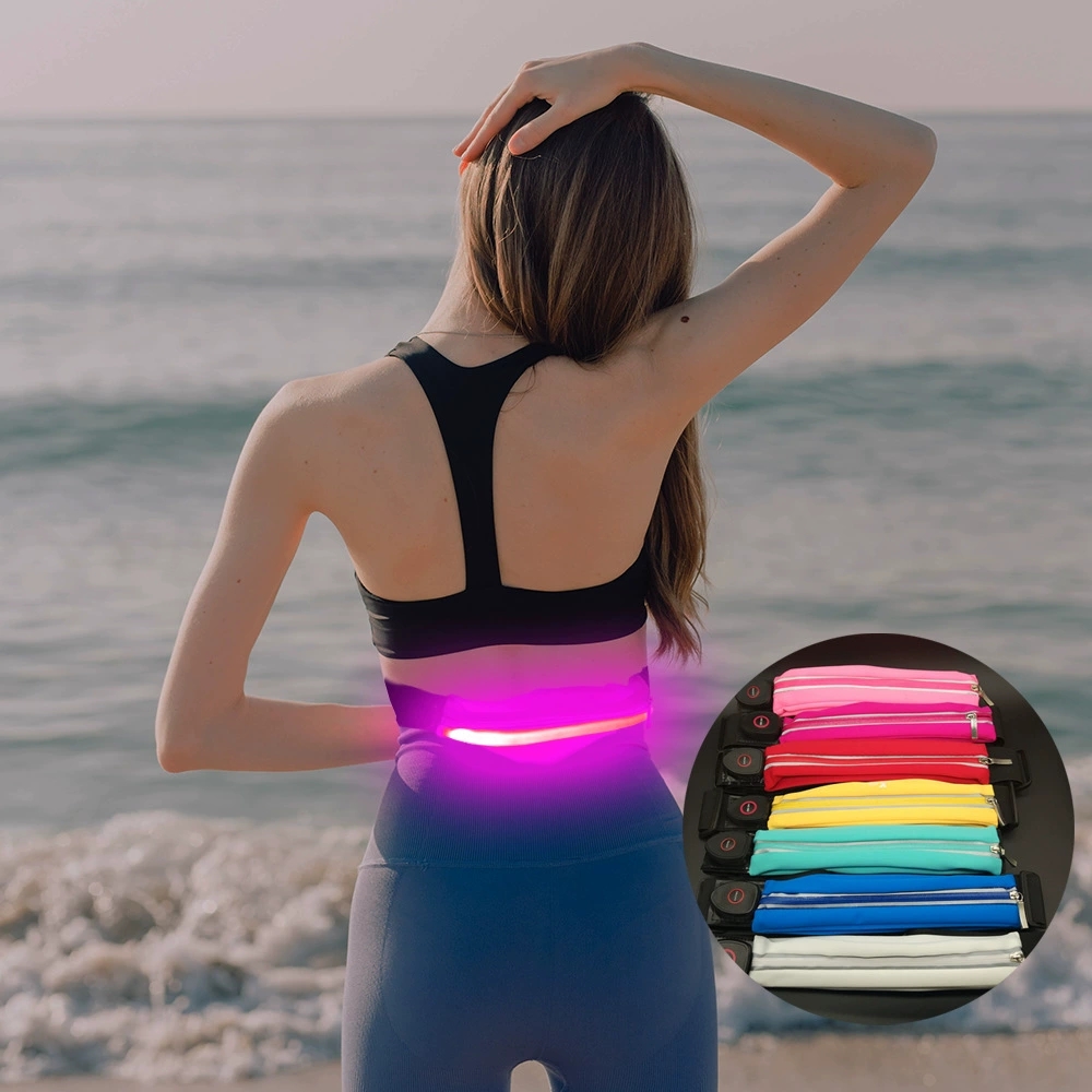 Light up waist bag with USB charging and custom colors. Adjustable belt fits most sizes. Holds phone, keys, and essentials. Ideal for sports and nighttime activities.